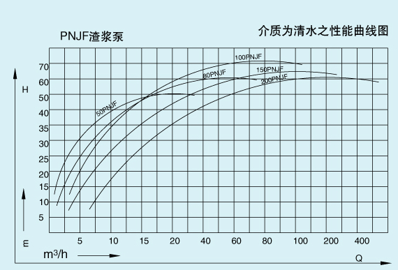 九十年代引进日本技术、研制开发系列渣浆泵,系单级单吸离心式衬胶泵,可输送各类有腐蚀性渣浆及固体颗粒的矿浆。输送矿浆大浓度不超过百分之六十五(重量计),温度不得超过100℃,被广泛适用于冶金、矿山、金矿、铜矿、锌矿、铅矿、锰矿、矾矿、石油、化工、煤炭、电力、交通、河流疏浚、建材及市政工程等等工业企业的工况岗位。小型泵采用金属骨及特种橡胶模压成形;大型泵采用活络衬胶,减少维修费用,80PNJF、100PNJF、150PNJF的排出口在270℃范围内可按45℃间隔转不同的方向,在没有特殊说明的情况下,一律为垂直向上出口,泵的旋转方向,为泵盖所示标尖头方向旋转。
